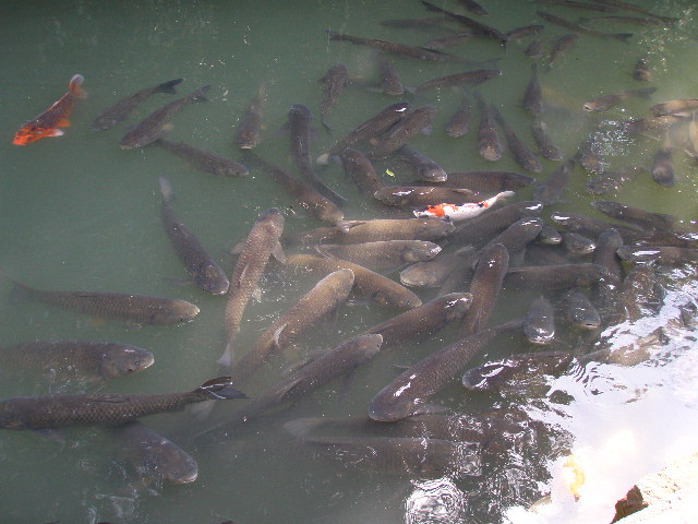 お堀の亀と鯉の大群。鯉も群れすぎると気持ち悪いがね