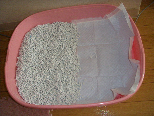 大きめの猫トイレに紙砂とペットシーツを半分づつ